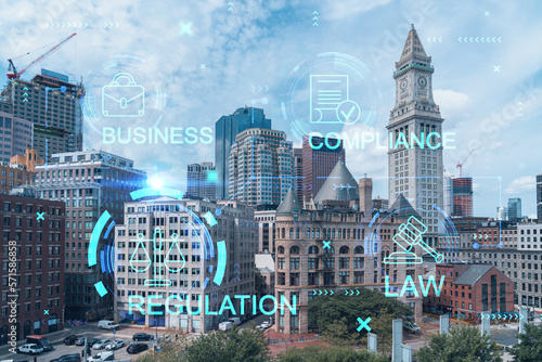© VideoFlow, Fototapeta premium Financial downtown city view panorama of Boston from Harbor area at day time, Massachusetts. Glowing hologram legal icons. The concept of law, order, regulations and digital justice.