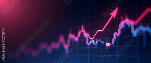© HaJung, Naklejka premium Financial graph with uptrend line candlestick chart in stock market on neon color widescreen background. concept as Financial graph showing uptrend line with candlestick chart in stock market set on n