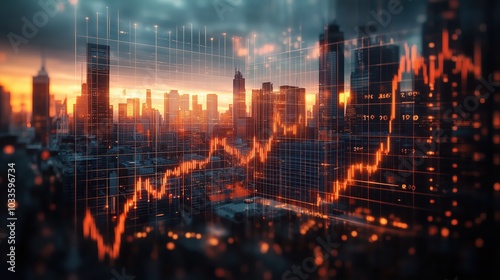 Naklejka premium Financial Growth with Marketing Insights. City skyline during sunset reflects financial growth trends. Overlaid graph symbolizes investment opportunities & marketing insights crucial for businesses.