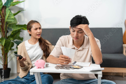 © wichayada, Fototapeta premium Financial Planning. Couple arguing over bills and budgeting while using smartphone.