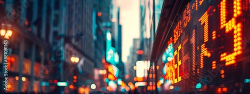 © SayLi, Obraz premium financial stock screen display trade market. outside in city street. people walking economical business company growth. numbers glowing. banner wallpaper background for ads, web design, print, sites