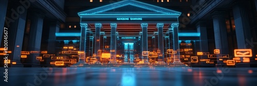 © Ilja, Obraz premium Financial Technology Concept, With Neon Bank Design Illuminated by Abstract Data and Icons