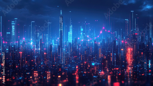 Fototapeta premium Financial Technology Trends in Blue Graphs Over Cyber Cityscapes