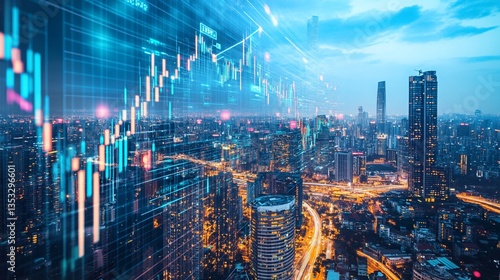 Fototapeta premium Financial trading in a futuristic city with digital data overlay and blue light