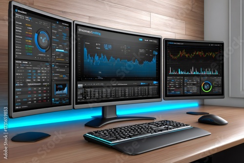 © Lubos Chlubny, Fototapeta premium Financial trading workspace with multiple computer screens displaying data