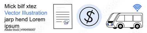 Obraz premium Financial transactions, wireless networks, public transit, connectivity, mobile apps, modern systems. Document, dollar symbol bus with wireless icon. Financial transactions and wireless networks