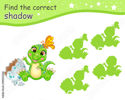 Obraz premium Find correct shadow of green baby dinosaur vector illustration