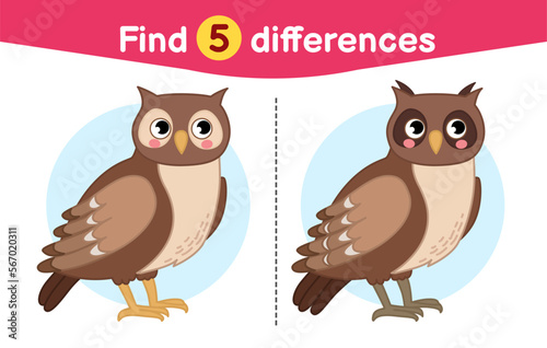 © Алёна Игдеева, Obraz premium Find differences. Educational game for children. Cartoon vector illustration of cute owl.