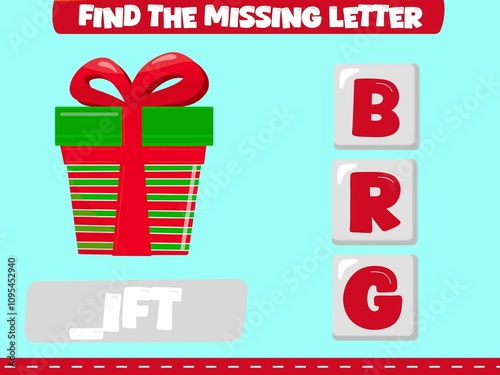 Fototapeta premium Find missing letter. Cute cartoon gift box , kindergarten worksheets,Educational spelling game for kids.