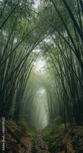 Naklejka premium Find peace walking the mystical misty bamboo forest path with tall green...