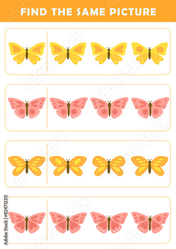 © G.rena, Naklejka premium Find same picture worksheet for kids. Worksheet for kids kindergarten, preschool and school age. Education game for children with cute butterfly illustration.