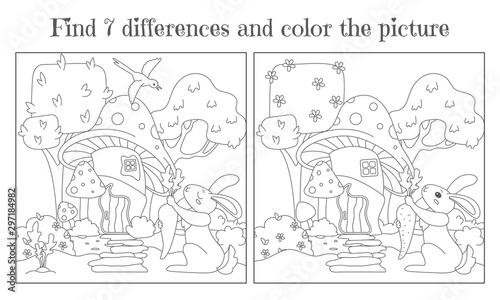 Fototapeta premium Find seven differences and paint a picture. A mushroom house in the forest and a hare with a carrot. Vector