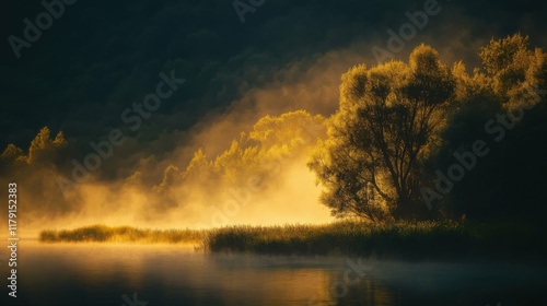 © Валерий Тодаренко, Obraz premium Fine golden mist settling softly, glowing faintly against a dark background, creating an ethereal and atmospheric ambiance