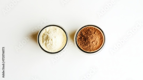 © Solaz, Fototapeta premium Fine White and Brown Powders in Glass Containers on White Surface