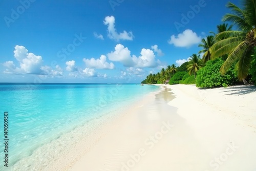 Fototapeta premium Fine white sand, clear aqua water, distant lush vegetation, paradise, sky