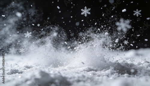 © Abhi, Obraz premium Fine white snow dust mixed with small snowflakes drifting in the air, isolated on black background, soft diffusion, subtle motion blur