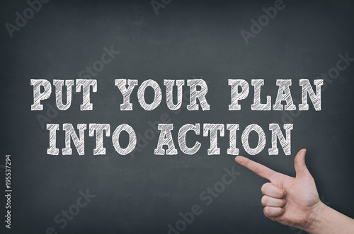 Fototapeta premium Finger pointing on Put Your Plan Into Action text on the blackboard