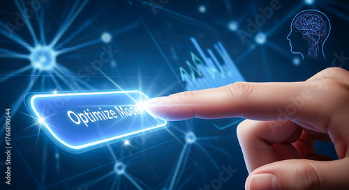 © MD NAZMUL, Fototapeta premium Finger pressing blue button optimize model with brain graphic