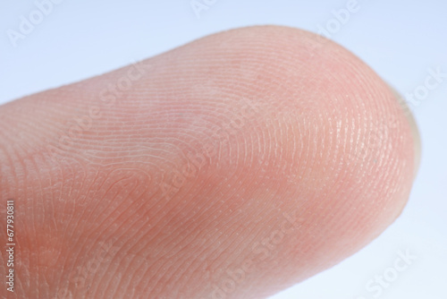 © New Africa, Fototapeta premium Finger with friction ridges on light blue background, macro view