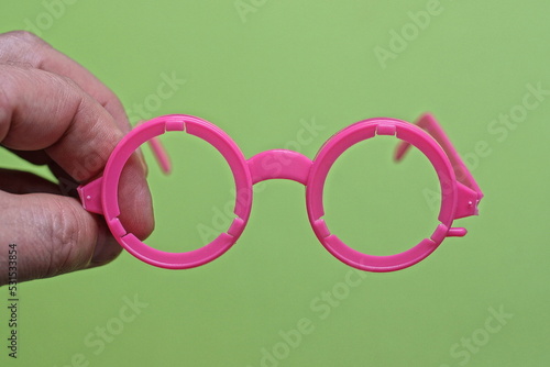 Fototapeta premium fingers on the hand hold one plastic pink toy glasses on a green background
