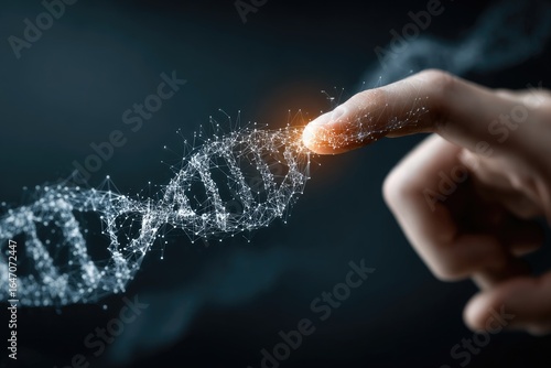© Yusnira, Fototapeta premium Fingertip touches glowing DNA