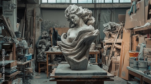 © Yeivaz, Fototapeta premium Finished stone sculpture displayed prominently in a workshop setting