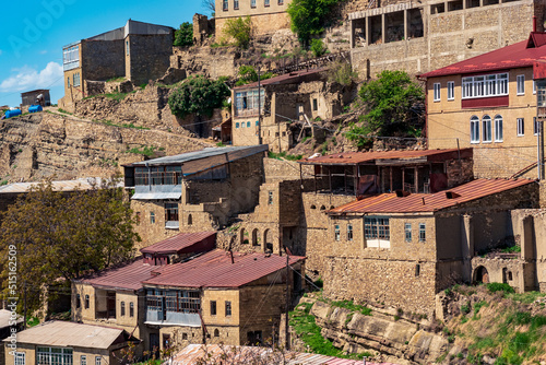Obraz premium finished, under construction and destroyed houses of different times in the ancient mountain village of Chokh in Dagestan