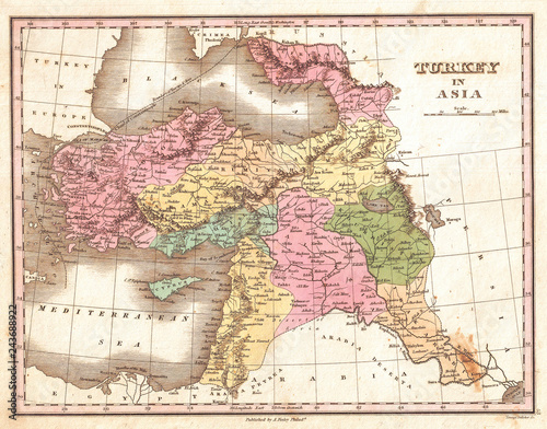 Obraz premium 1827, Finley Map of Turkey in Asia, Iraq and Israel, Palestine, Anthony Finley mapmaker of the United States in the 19th century