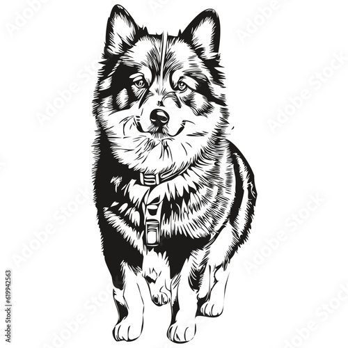 Fototapeta premium Finnish Lapphund dog pet sketch illustration, black and white engraving vector