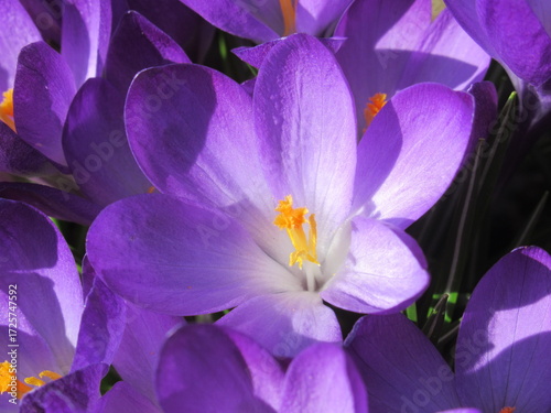 Naklejka premium Fioletowe krokusy skąpane w promieniach słońca