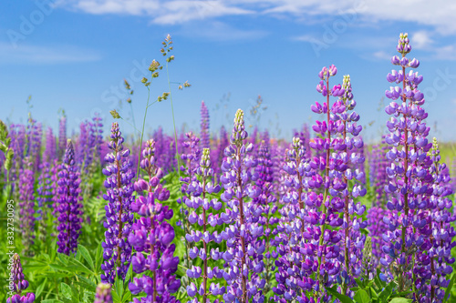 Naklejka premium fioletowy kwiat łubinu zbliżenie na zewnątrz.Lupinus, łubin, łubin pole z...