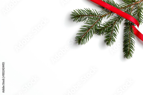 Obraz premium Fir branch with red ribbon on a white background in the upper right corner