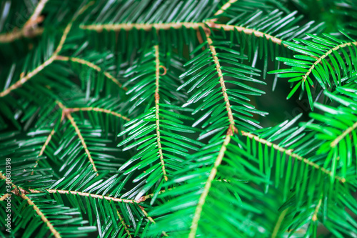 © OlegVD, Fototapeta premium Fir branches in the forest on a dark background. Spruce needles.