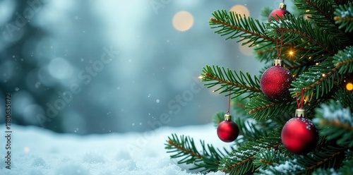 © Sutasinee, Obraz premium fir branches with Christmas decorations on a plain plane background, winter, Christmas, tree