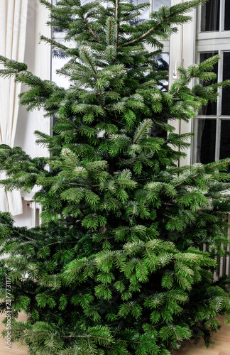 Fototapeta premium Fir christmas tree without decoration is standing at home in a room with big windows