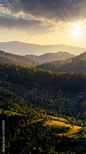 © Pellinni, Fototapeta premium fir forest on a hill at sunset