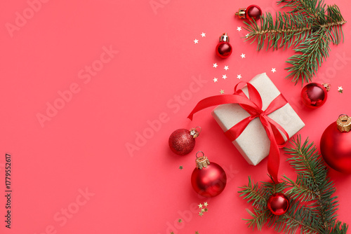 © New Africa, Obraz premium Fir tree branches, gift and Christmas decor on red background, flat lay. Space for text