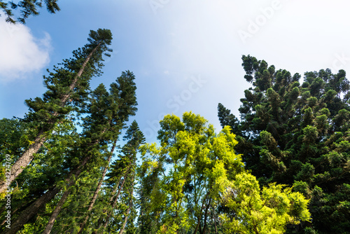 © xy, Obraz premium Fir trees and branches against blue sky background