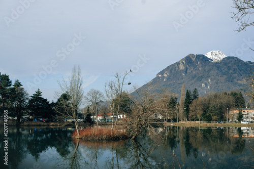 © Hanna, Fototapeta premium fir trees and mountains reflected in the lake