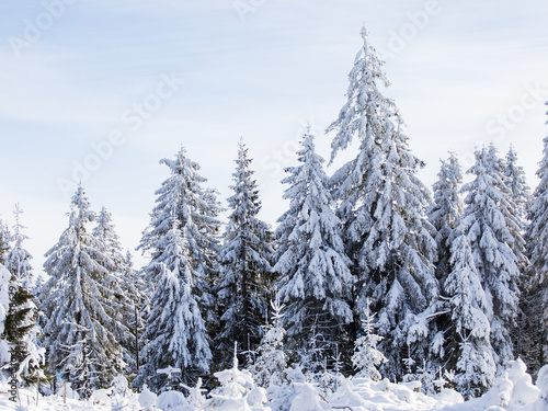 Fototapeta premium Fir trees covered in snow winter scenery with blue sky