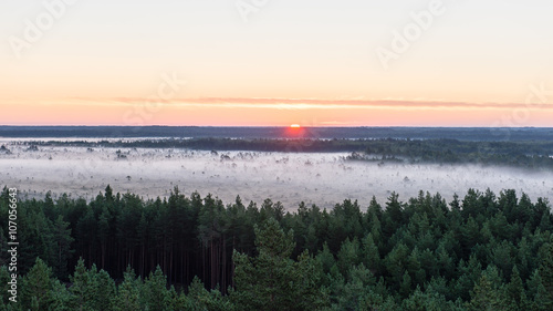 © Martins Vanags, Fototapeta premium fir trees on a meadow down the will to coniferous forest in fogg