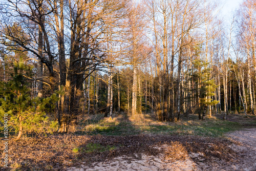 © Martins Vanags, Obraz premium fir trees on a meadow down the will to coniferous forest in foggy forest