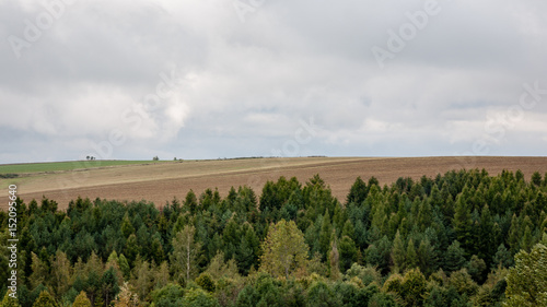 © Martins Vanags, Fototapeta premium fir trees on a meadow down the will to coniferous forest in foggy forest