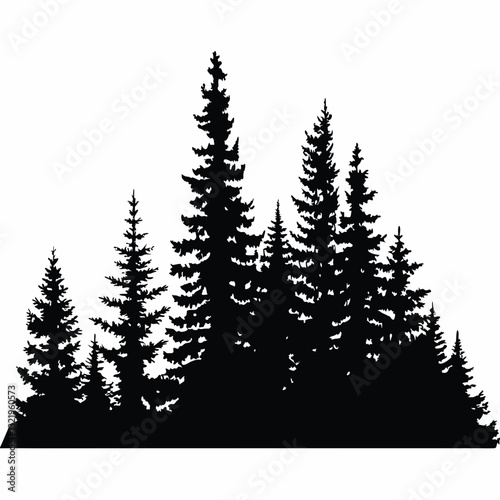 © MSTPANNA, Fototapeta premium Fir trees silhouettes, Coniferous spruce horizontal background patterns, black evergreen woods vector illustration. Beautiful hand drawn panorama with treetops forest, forest silhouette