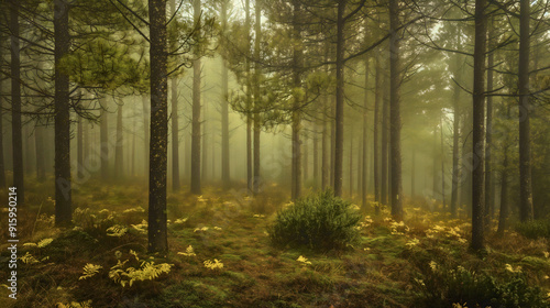 © RaeLi, Obraz premium Fir trees that grow deep in the forest, with recognizable dried brown needles falling underneath, from fir trees.