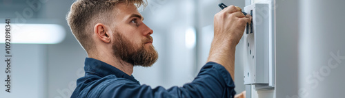 © SJ Studio, Obraz premium Fire Alarm System Response Concept. A focused man with a beard writes on a wall-mounted device, showcasing his professional expertise in a modern workspace.