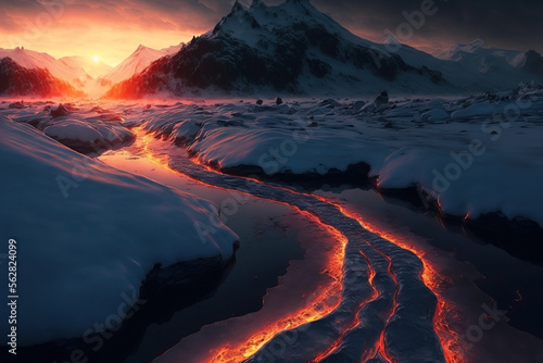 Fototapeta premium Fire and ice concept. Good and evil. Lava river cutting through a frozen winter landscape. Hot and cold. Warm sunset tones. Cold stormy tones.