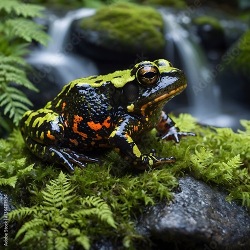 © AmuvitaGamage, Fototapeta premium Fire-Bellied Toad Relaxing by Waterfall in a Secluded Forest Glade