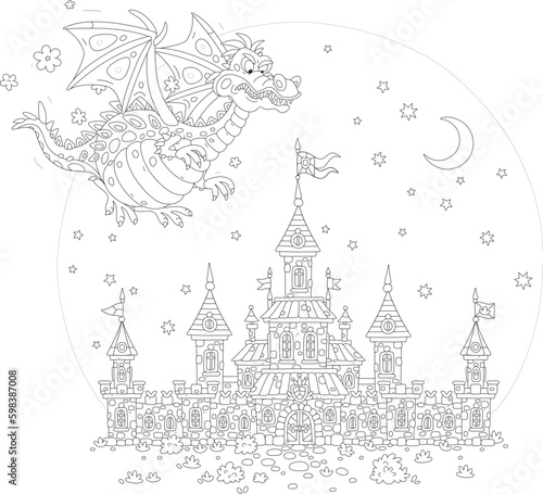 © Alexey Bannykh, Naklejka premium Fire-breathing dragon flying over a fairytale castle with high towers, defensive stone walls, gates, waving royal flags at a mysterious moonlit night, black and white outline vector cartoon illustrati