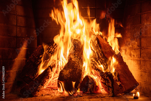 Obraz premium Fire burning in a fireplace, wood logs, flames. Warm home, heat. Christmas...